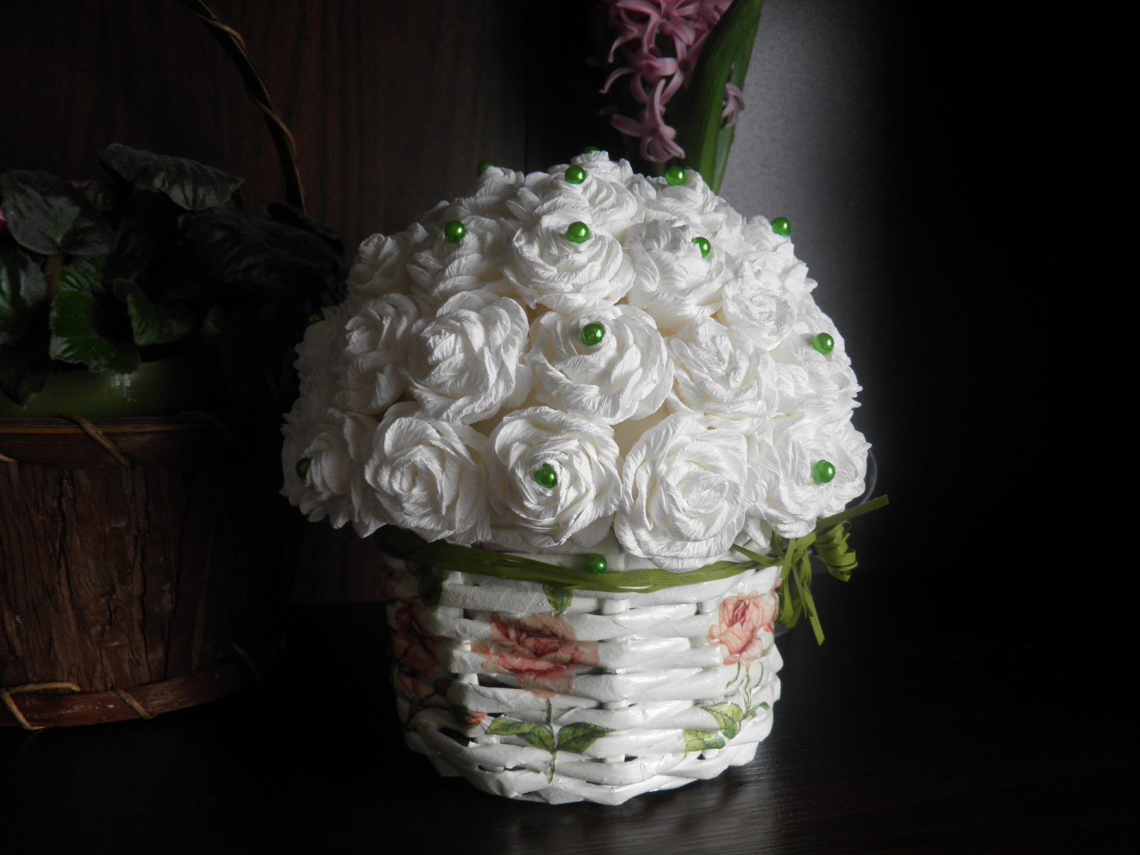 Koszyczek moj pierwszy ,niezle sie napracowalam zeby wyszedl w miare prosty i wyszedl jak na pierwszy raz nizle , kula 12 cm i rozyczki z bialej krepy. Nawet mi sie podoba chociarz zamierzalam zrobic w różowym kolorze.